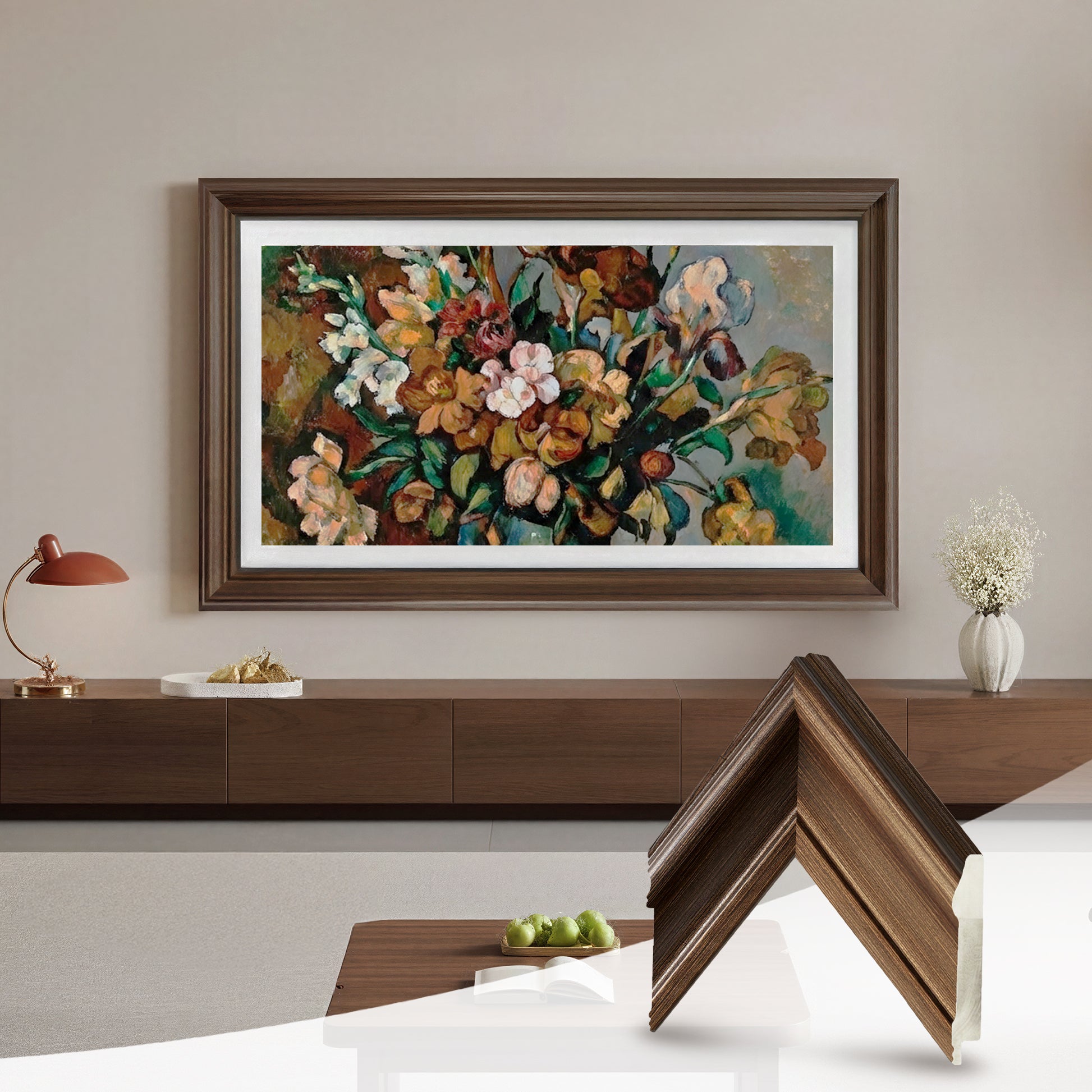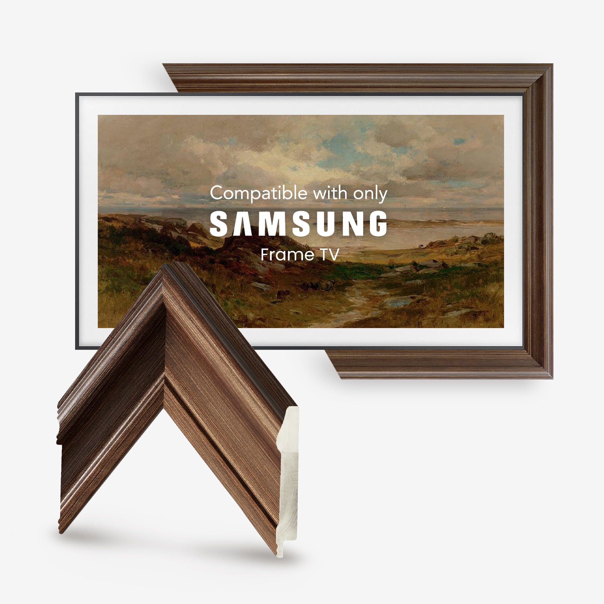 FrameforTV frames are compatible with Samsung The Frame, TCL NXTVISION, LG, Sony, and most slim-bezel flat TVs.