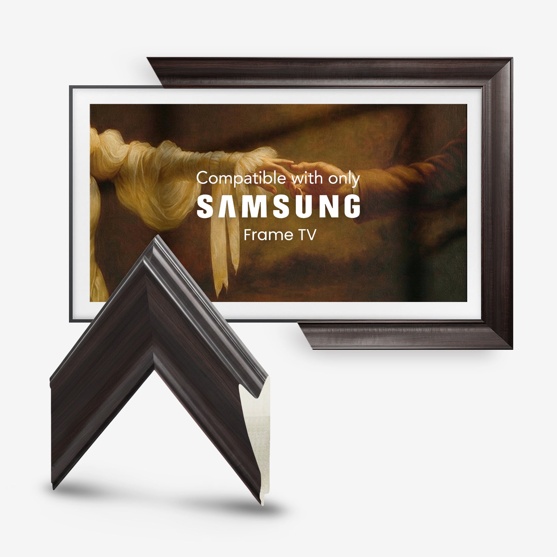 FrameforTV frames are compatible with Samsung The Frame, TCL NXTVISION, LG, Sony, and most slim-bezel flat TVs.